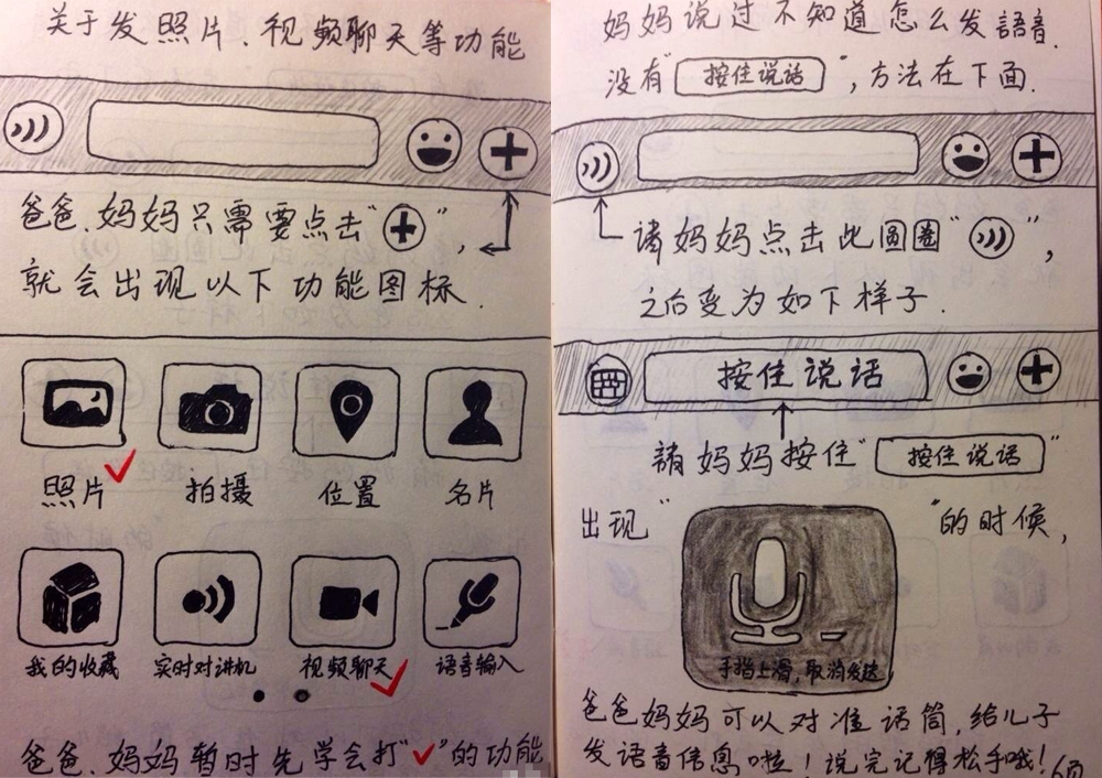切入点仍是亲情,为了父母能更容易学懂“高科技”、与远方的孩子畅快交流,大学生用心地手绘了一套“微信使用说明书”。